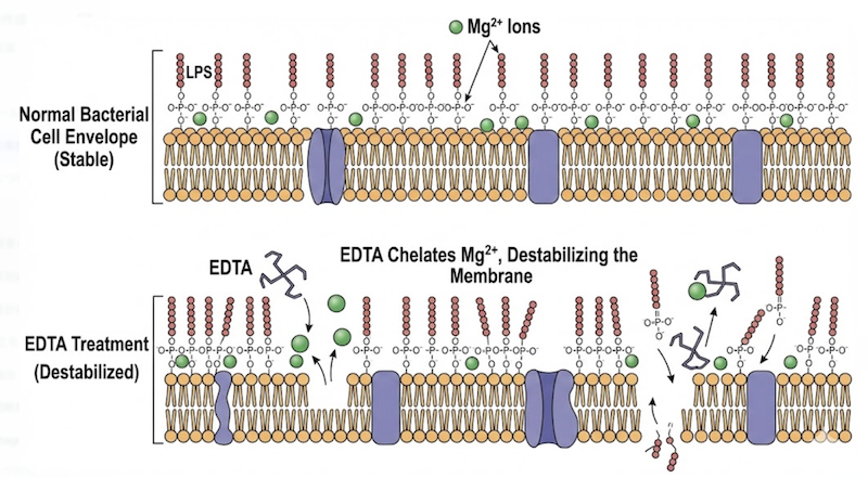 1. Destabilization of the Cell Envelope: The outer membrane of E. coli is stabilized by divalent cations that cross-link phosphate groups within the lipopolysaccharide (LPS) layer. By sequestering these ions, EDTA disrupts outer membrane integrity, compromising the cell’s structural barrier. This “puncturing” renders bacteria fragile and permeable, ensuring that the detergent (SDS) introduced in Step 2 can immediately access and solubilize the membrane.