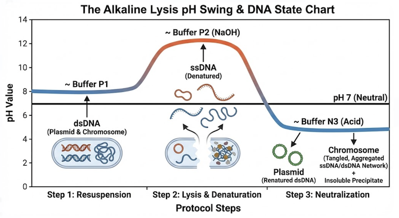 The “pH Swing” of Alkaline Lysis: DNA Dynamics Across Steps. (Step 1) Resuspension (pH ~8.0): In the buffered solution, both plasmid and genomic DNA exist in their native, stable double-stranded helical form. (Step 2) Lysis & Denaturation (pH ~12.5): The addition of NaOH causes a dramatic spike in pH. At this alkalinity, hydrogen bonds break, and all DNA denatures into single strands. However, plasmid strands remain physically interlocked (catenated) due to their closed circular topology. (Step 3) Neutralization (pH drops to ~7.0): The addition of acidic potassium acetate rapidly restores neutral pH. The interlocked plasmid strands instantly “snap back” to reform soluble, supercoiled dsDNA. In contrast, the separated genomic strands essentially get lost, tangling into an insoluble mess that precipitates out of solution.