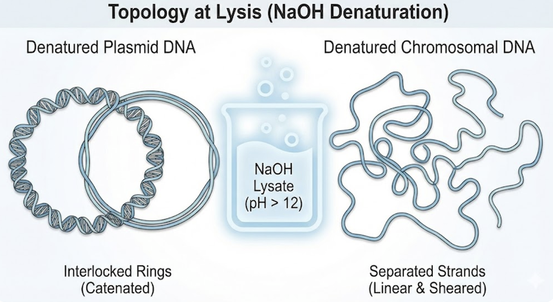 This process affects all DNA molecules present, but the outcome differs dramatically based on molecular topology—a distinction that forms the entire foundation of alkaline lysis.