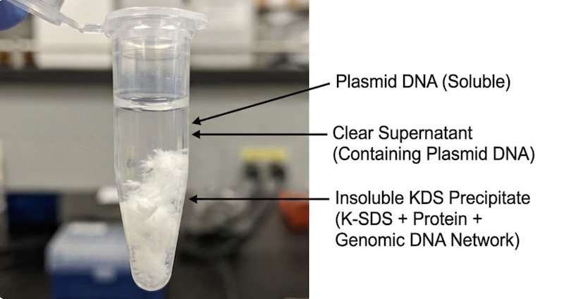 The “White Fluff” Phenomenon: Selective Precipitation by Potassium Dodecyl Sulfate (KDS). Mechanism of Separation: Upon addition of the Neutralization Buffer (containing Potassium Acetate), the detergent SDS switches from its soluble sodium form to the highly insoluble Potassium Dodecyl Sulfate (KDS) form. The Precipitate (White): The insoluble KDS creates a rigid molecular network that entraps denatured proteins, cell debris, and the massive, tangled web of genomic DNA. This aggregate forms the characteristic white flocculent precipitate seen in the tube.The Supernatant (Clear): In contrast, small supercoiled plasmid DNA molecules renature rapidly and are compact enough to slip through the pores of the KDS network, remaining dissolved in the clear supernatant