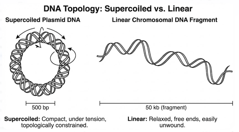 The Tale of Two Topologies: Supercoiled vs. Linear DNA. (Left) Supercoiled Plasmid DNA: In its native state, plasmid DNA exists as a covalently closed circle that is tightly twisted upon itself, much like a coiled telephone cord. This compact “supercoiled” topology is robust and plays a critical role in keeping the two DNA strands physically interlocked even when denatured. (Right) Linear Chromosomal DNA: In contrast, the massive bacterial chromosome is inevitably sheared into linear fragments during the mechanical stress of lysis. Because these molecules have free ends and lack the topological constraints of a closed circle, their strands can completely separate and drift apart under alkaline conditions.