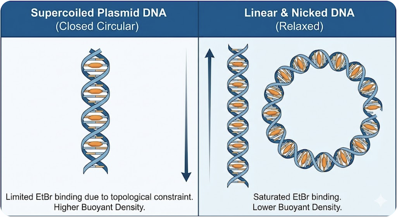 Differential Intercalation of Ethidium Bromide based on DNA Topology. This schematic illustrates the physical principle behind the separation of plasmid DNA in CsCl-EtBr gradients. Linear & Nicked DNA (Unconstrained): Because the strands are free to rotate, the helix can unwind significantly to accommodate saturating amounts of Ethidium Bromide (EtBr). This high dye loading drastically lowers the buoyant density of the DNA molecule. Supercoiled DNA (Constrained): Native plasmids are covalently closed circles. As EtBr intercalates and unwinds the helix, the DNA creates compensating superhelical twists (tension). This topological constraint limits the amount of EtBr that can bind. The Result: Since supercoiled DNA binds fewer “light” EtBr molecules than linear or nicked forms, it retains a higher buoyant density and migrates to a lower position in the density gradient.