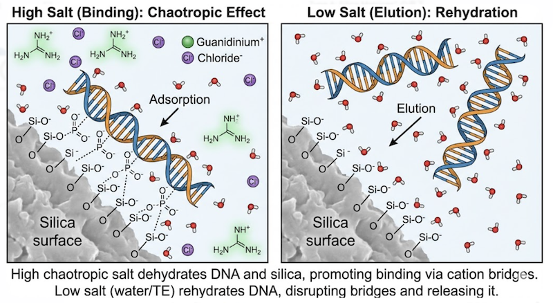 At high chaotropic salt concentrations (typically 4-6 M guanidine) and slightly acidic pH (pH 6.5-7.5), DNA adsorbs tightly to the silica membrane through a combination of hydrogen bonding and electrostatic interactions mediated by positively charged guanidinium ions acting as salt bridges.