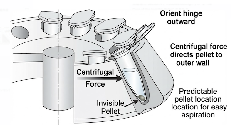 Locating the Invisible Pellet using Tube Orientation. This practical guide illustrates the “Hinge Trick” for recovering invisible or translucent DNA pellets. Tube Orientation: When placing microfuge tubes in a fixed-angle rotor, always orient the plastic hinge of the lid pointing outward (away from the center). Centrifugal Force: During centrifugation, the force vector directs all solid material toward the outermost point of the tube’s bottom. Pellet Location: Consequently, the pellet will always form on the side of the tube directly aligned with the hinge. Even if the pellet is invisible to the naked eye, you can confidently pipette the supernatant from the opposite side, ensuring maximum recovery without disturbing your DNA.